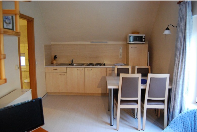 Separate Wohnung über 2 Etagen, 33qm für max. 4 Personen, ausziehbare Sitzgarnitur, Pantryküche mit Kühlschrank und Mikrowelle, Bad mit DU/WC, 2 Betten unterm Spitzdach, Terrasse mit Gartenmöbel, Glasfaser Internet & WLAN